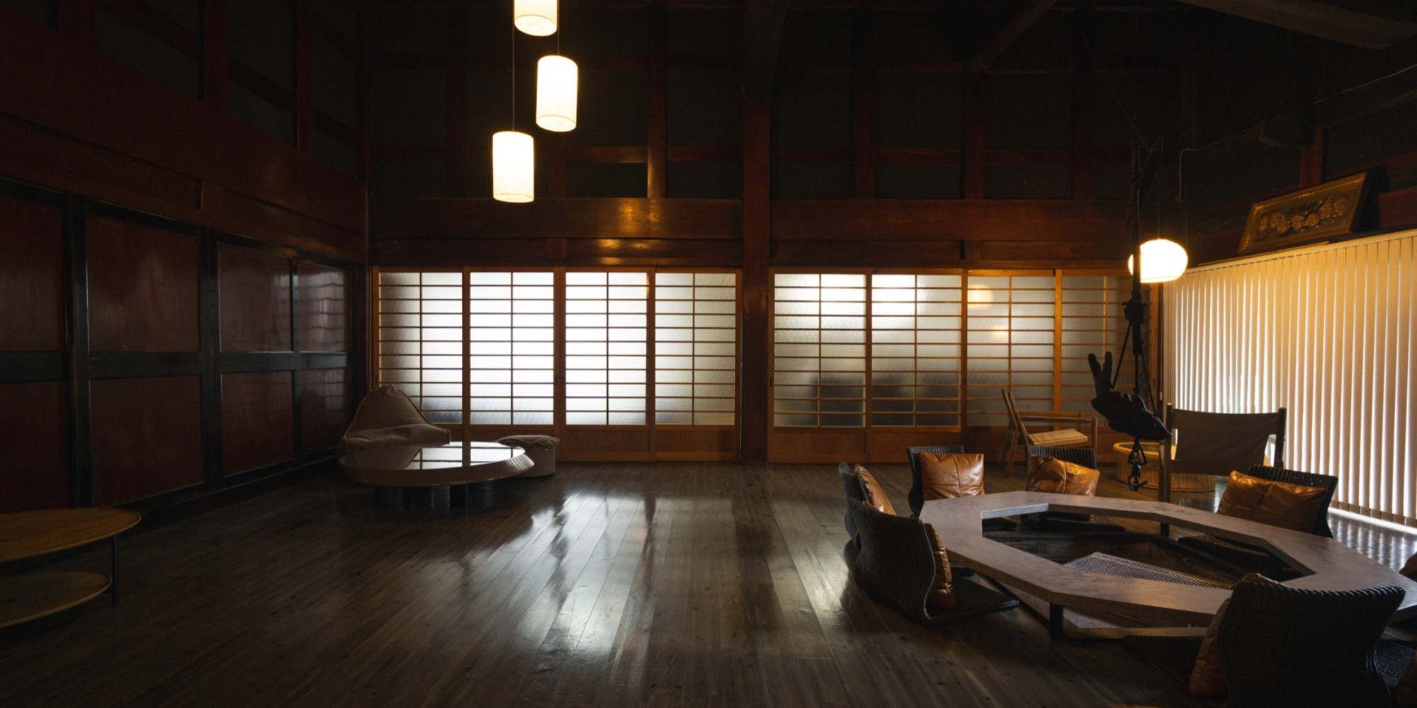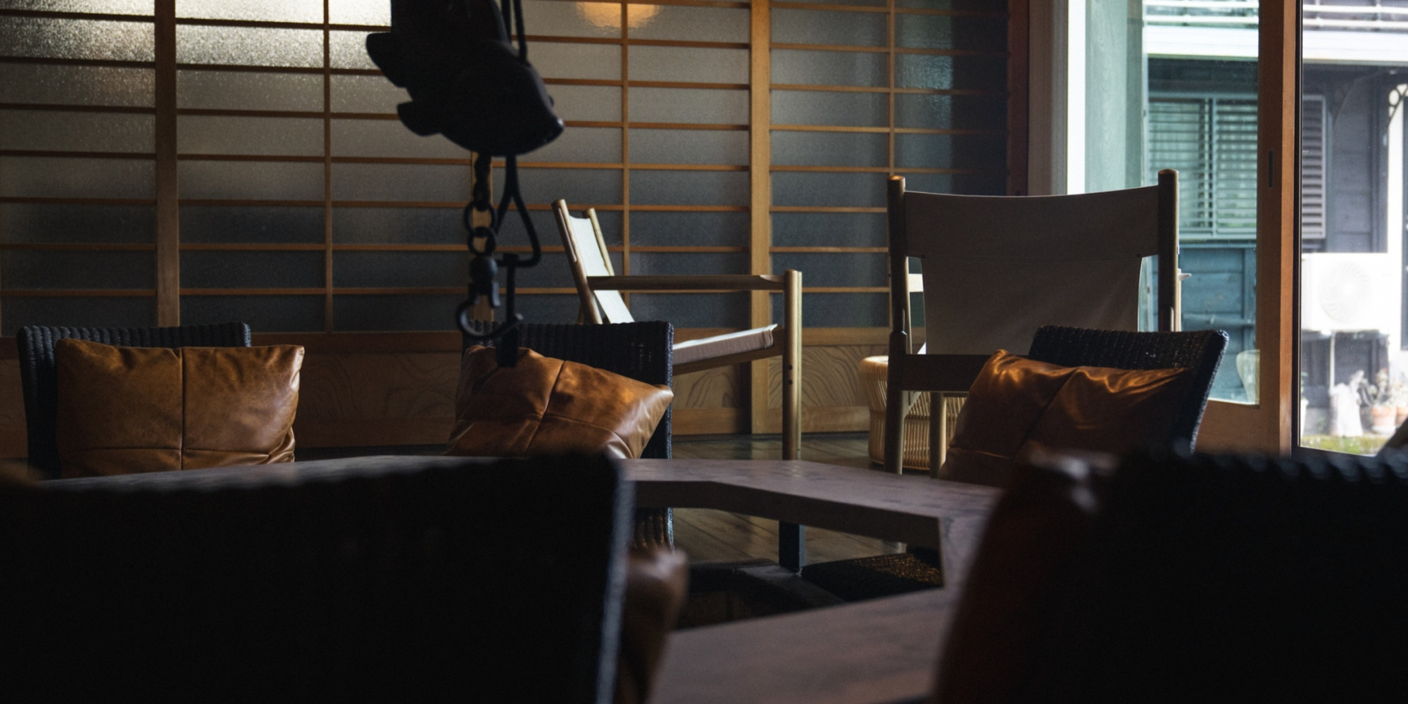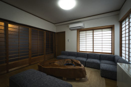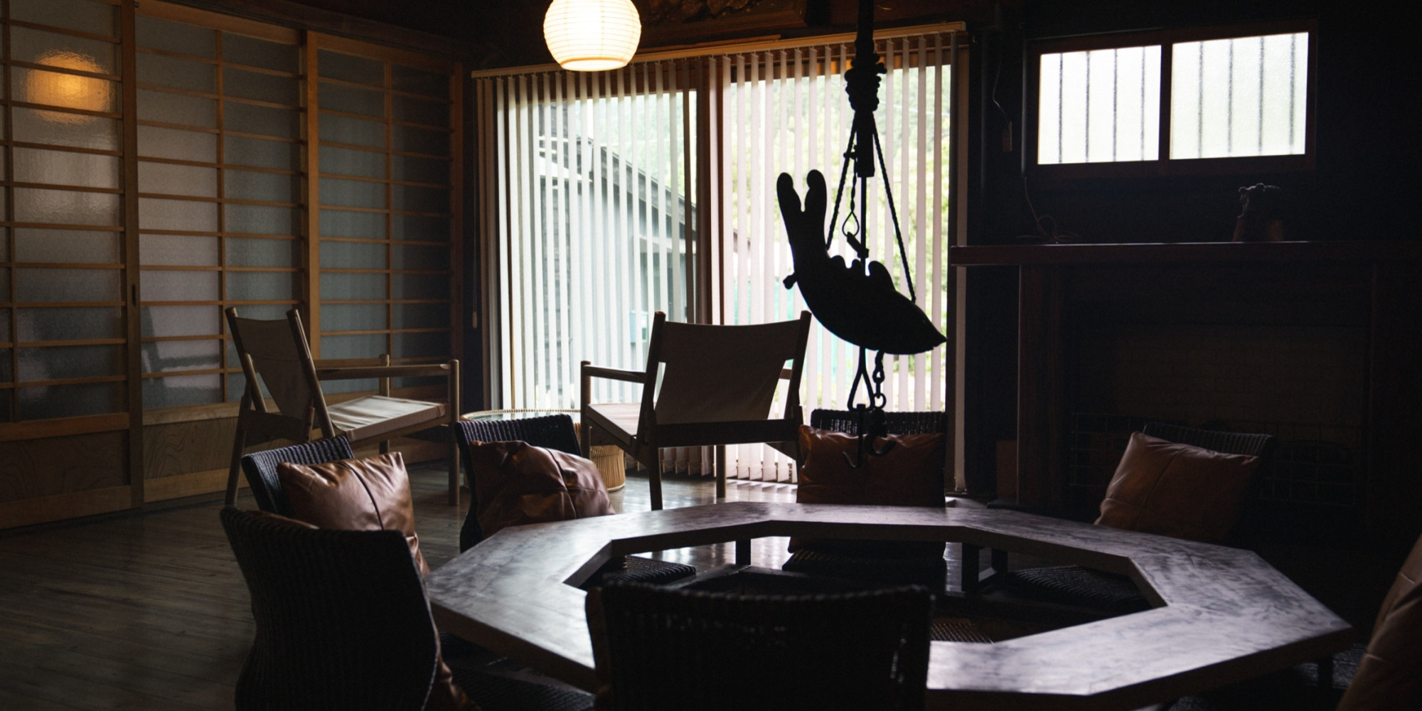 室に続く和室“らんま”。障子越しの柔らかな光と畳の香りが心を解き、昼は囲炉裏部屋での語らい後にお茶やコーヒーを、夜は布団で深い眠りへ誘います。