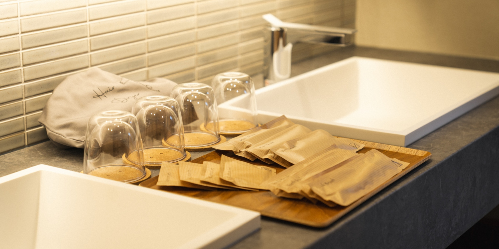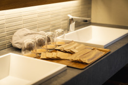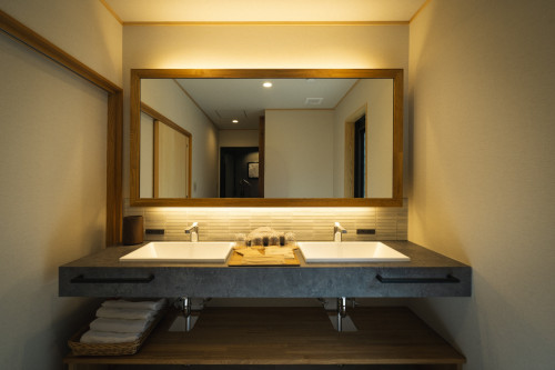 古民家でもホテルライクな清潔感ある洗面・浴室を新設しました。ツインボウルで朝の支度もスムーズです。