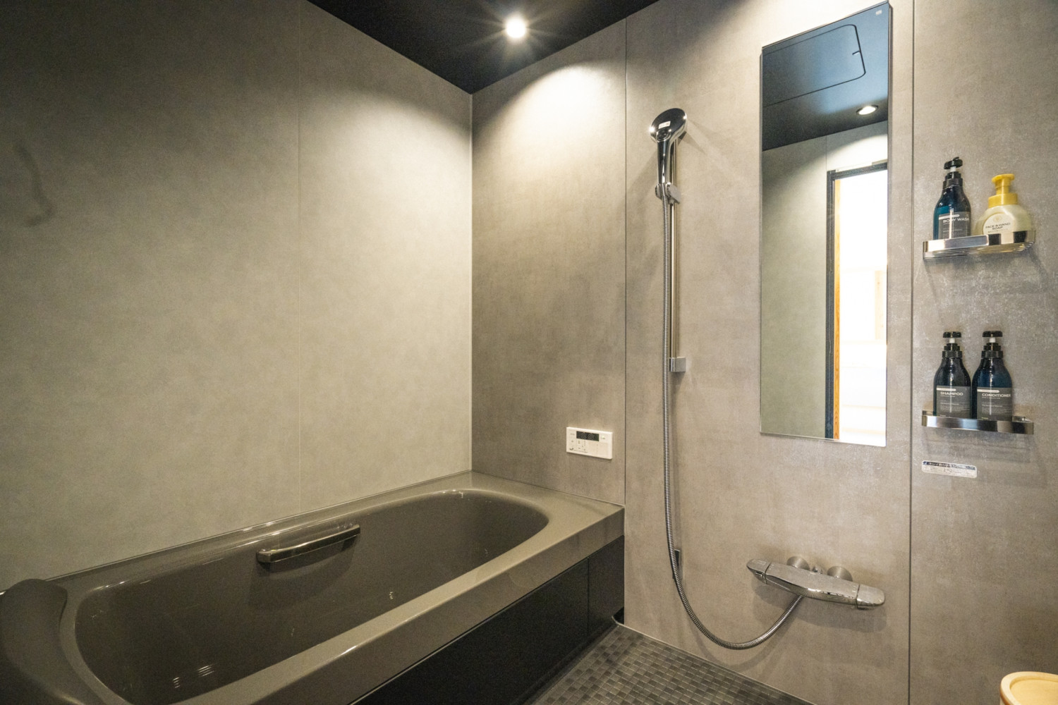 鏡は曇り止め仕様。上質なタオルやアメニティも充実し、夜更けのバスタイムまで贅沢に楽しめます。